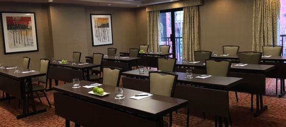 This 650-square-foot room is located on the Eastside of Mezzanine level overlooking the lobby. It features a built-in credenza and two sets of French doors overlooking the tree-lined avenues outside the hotel.